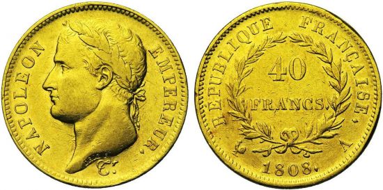 "FRANCE, Napoléon Ier (1804-1814), AV 40 francs, 1808 A, Paris. Tête laurée. Très Beau. (France, Napoleon I (1804-14), gold forty francs of 1808, Paris mint, laureate head. Very fine.)"