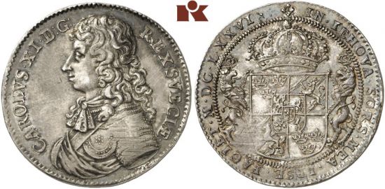 Während der gesamten als "Karolinische Zeit" bezeichneten Zeitspanne von 1654 - 1718 war das schwedische Hauptnominal der Carolin, das 2-Mark-Stück in Silber sowie das mehrfache und Teile davon. Riksdaler wurden hingegen äußerst selten und nur in kleinen Auflagen geprägt. In der 37jährigen Regierungszeit Karls XI. geschah dies nur ein einziges Mal im Jahr 1676, als Riksdaler in einer Auflage von nur 791 Stücken geprägt wurden. Die Stempel wurden vermutlich von Anton Meybusch geschnitten, und die Rückseite ist eine exakte Imitation des Riksdalers 1654 mit dem Wahlspruch "In Jehova sors mea ipse faciet" (= Mein Schicksal liegt bei Gott, er soll es selbst gestalten). Sonst ist diese Devise des Königs Karl X. Gustav, des Vaters Karls XI. nur auf den frühen Dukaten Karls XI. aus den Jahren 1662-1665 zu finden. Seit 1670 lautete der Wahlspruch auf den Gold- und Silbermünzen: "Dominus protector meus" (= Gott ist mein Beschützer). Die Umschrift auf dem Riksdaler 1676 war somit veraltet. Der Vorderseitenstempel weist ein ungewöhnlich tiefes Relief auf, weshalb die höchsten Partien der Vorderseite sowie die entsprechenden Stellen der Rückseite oft schwach ausgeprägt sind. (Throughout the "Carolinian period" of 1654-1718 the Swedish main coin was the Carolin, the two mark piece in silver as well as its multiples and parts. The riksdaler, however, was extremely rare and stamped in small numbers. In the 37-year reign of Charles XI, this happened only once in 1676, when 791 Riksdalers were issued. The dies were probably cut by Anton Meybusch, and the back is an exact imitation of 1654 Riksdalers with the motto "In Jehovah sors mea ipse faciet" (= My fate is in God, he should make it yourself). Otherwise, this motto of King Charles X Gustav, the father of Charles XI, only appears on the early ducats on Charles XI from the years 1662-1665. Since 1670 the motto on the gold and silver coins was, "Dominus protector meus" (= God is my protector). The inscription on the Riksdaler 1676 was therefore out of date. The front die has unusually deep relief, which is why the highest parts of the obverse and the corresponding points of the back are often weak.)"