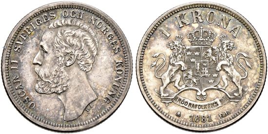 "SWEDEN. Oscar II. 1872-1907. 1 Krona 1881, Stockholm. Mit den Signaturen EB und LA (Emil Brusewitz, Münzmeister in Stückholm, 1876-1908, und Lea Ahlborn, Stempelschneiderin in Stockholm, 1854-1897). Gutes vorzüglich. NGC AU Details. Patina. Gereinigt. (kingdom of Sweden, Oscar II, 1872-1907, krona of 1881 with mintmaster's initials "EB" and engraver's initials "LA". Good extremely fine, Toned, Cleaned.)"