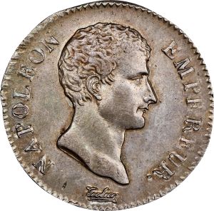 This specimen was lot 34137 in Stack's Bowers NYINC sale (New York, January 2025), where it sold for $18,000. The catalog description[1] noted, "FRANCE. Empire. 2 Francs, Year 14-K (1805/6). Bordeaux Mint. Napoleon I. PCGS AU-58. Quite boldly and sharply struck, this alluring specimen--emanating from a VERY RARE mint that features one of the lower mintages of the year--stands as an incredible opportunity for the advanced collector. From the Richard Margolis Collection." This half dollar-sized coin was struck at Bordeaux under the régime of Napoleon as emperor. The type was struck AN12-14 only and is rather scarce. It was demonetized in 1869. The catalog[2] notes 35 dates for the type, most very rare. This date is unpriced in Le Franc.