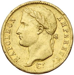 The French empire produced large quantities of gold coins, made from metal looted from countries Napoleon conquered. However, gold coins of the French branch mints are very scarce as a class and have long been underpriced, mostly because the few survivors are in poor condition. This is the final twenty francs for Napoleon, struck 1809-14 with a laureate head and "EMPIRE FRANCAIS" on the reverse. It is the most plentiful type but this issue is very scarce.
