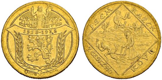 "Republik. 2 Dukaten 1928, Kremnitz. 10. Jahrestag der Republik. Sehr schön-vorzüglich. (republic of Czechoslovakia, double ducat of 1928, Kremnitz mint, tenth anniversary of the republic. Very fine-extremely fine.)"