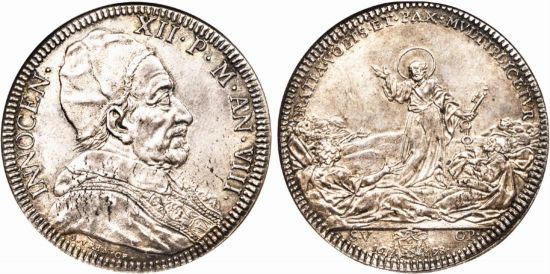 The first coin was lot 9468 in Ponterio sale 150 (Los Angeles, August 2009), where it sold for $2,070. The catalog description[1] noted, "ITALY. Papal States. Piastra, 1698/Year VIII. Innocent XI (1676-89). St. Peter blessing crowd. Struck for the first anniversary of the Peace of Ryswick. Nice grade for type. Lovely original toning. NGC AU-55." Coinage of the Papal States remains popular today for, besides the strong associations for Catholics, this period saw a string of commemorative issues featuring wonderfully vivid portraits of the various men who occupied the throne of St. Peter. This issue is among the more available. Innocent XII (not Innocent XI as listed in the catalog description) ruled 1691-1700.