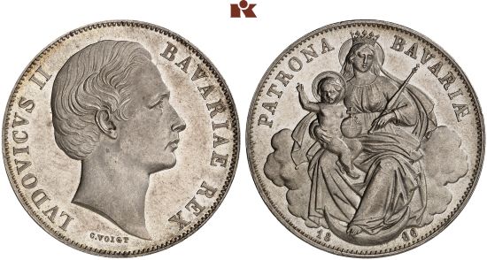 "BAYERN, HERZOGTUM, SEIT 1623 KURFÜRSTENTUM, SEIT 1806 KÖNIGREICH, Ludwig II. 1864-1886. Vereinstaler 1866. Feine Patina, vorzüglich-Stempelglanz. (kingdom of Bavaria, Louis II, 1864-86, union thaler of 1866. Fine patina, extremely fine to uncirculated.)"