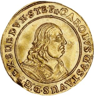 "Beautiful 2 Ducats from Pomerania, SWEDEN. Pomerania. 2 Ducats, 1658. Szczecin Mint. Karl X Gustav. NGC AU-58. Mintmaster: Ulrich Butkau. A great RARITY, this nicely presented 2 Ducats from the period of Swedish Occupation of Pomerania delivers good luster, with sharp details throughout. Only a light touch of wear is seen on the elevated portions of the design, with limited strike weakness. Some minor disturbances on the edge are also noted for completeness. A popular issue, due to the crossover appeal between Sweden, Poland, and Germany; this coin stands at the confluence of these nation's histories, and provides a historical memento of the Swedish Occupation of Pomerania. Szczecin or Stettin, on the Oder river just 40 Miles from the Baltic Sea, lies on the Polish/German border and has held strategic importance for centuries. Ex: Countship of Brahesminde Collection (Private Sale - 1922)"