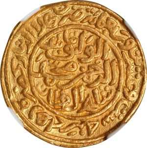 This specimen was lot 73605 in Stack's Bowers Collector's Choice sale (Costa Mesa, CA, February 2023), where it sold for $1,620. The catalog description[1] noted, "INDIA. Sultans of Delhi. Dinar, AH 726 (1325/6). Hadrat Delhi Mint. Mohammad III Bin Tughluq. NGC MS-63. A well-centered Dinar with sharp, bold legends. The surfaces offer tantalizing originality, showing rich golden brilliance and hardly any evidence of handling." The sultans of Delhi struck an extensive series of gold coins (Fr-402 thru Fr-502) starting about AH 589 (1193 AD). Most of the rulers had very short tenures but Mohammad III survived twenty-six years (AH 725-752). This is one of his more common issues.