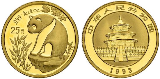 "CHINA, Volksrepublik, 25 Yuan 1993. Panda. Polierte Platte. FDC. (People's Republic of China, twenty-five yuan of 1993, panda series, Choice Proof.)"