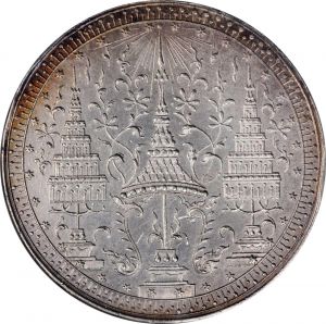 "Rama IV Commemorative Tamlung. THAILAND. 4 Baht (Tamlung), ND (1864). Rama IV. NGC Unc Details--Cleaned. Struck to commemorate Rama IV's 60th birthday. The obverse depicts the standard design as found on regular circulation issues of this era. The reverse displays the central inscription "Kingdom of Siam" within a cubed star frame with the Chinese inscription around "Cheng Ming Tung Pao" (Negotiable Currency of Cheng Ming). The devices are boldly struck with good definition of the fine details, both sides show evidence of being cleaned long ago now slightly subdued by a thin layer of tone with richer coloration near the rims, the reverse does exhibit several minor disturbances in the fields and surface marks mentioned for the sake of accuracy. Despite its shortcoming this is a handsome example of this ever popular type in fairly high graded sure to be a welcome addition to the next collection it enters. It is believed that these pieces were never released for circulation and were struck for presentation to important Thai and Chinese citizens. According to Kann, the reason for a Chinese inscription was that Siam still admitted China's suzerainty over its country at this time. While Thailand still retained its domestic autonomy, China remained in control of certain affairs."