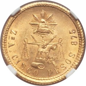 This specimen was lot 31292 in Heritage sale 3035 (Long Beach, September 2014), where it sold for $1,292.50. The catalog description[1] noted, "Republic gold 5 Pesos 1874 Zs-A MS63 NGC, Zacatecas mint. Choice Uncirculated with most attractive reddish toning and only few handling marks, as expected for the grade. Very elusive in this quality and should receive substantial attention as a type coin. From The FoxLair Collection." This type was struck in Zacatecas 1874-78 and 1883-92 and is a somewhat available mint.