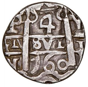 This specimen was lot 637 in Sedwick Treasure Auction 28 (Winter Park, FL, November 2020), where it sold for $8,400. The catalog description[1] noted, "Potosí, Bolivia, cob 4 reales Royal (galano), 1760Y-V-Y, extremely rare (unlisted), NGC VF details / edge filing. Typically very thick, even but small-diameter flan with bold and well-centered strike (super deep in places) but no legends (the king therefore indeterminate, but believed to be Charles III based on assayer), the assayer at upper-right clearly a Y with V at lower left and Y to right of cross, contrary to subsequent issues with V-Y-V instead, probably unique as unlisted in any references (either as a date or a type), but also particularly rare and important as lacking a peripheral hole, the stated edge filing no more than a few old lines at top. Pedigreed to the Aureo auction of March 2013 (lot #219)." The Spanish colony of Upper Peru produced hammered cob coinage at the Potosi mint from 1573 to 1773, with a major debasement scandal and subsequent reform occurring in 1649-1652. The royal or presentation issues are very rare and highly sought after, while the regular strikes vary in price according to the visibility of the date, mint, and assayer initials. The cobs were debased from 0.931 fine to 0.917 in 1728. Assayer "V" is listed for 1760-73.