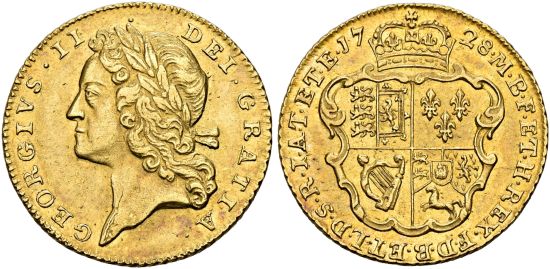 This specimen was lot 201 in Sincona sale 75 (Zurich, May 2022), where it sold for 12,000 CHF (about US$14,566 including buyer's fees). The catalog description[1] noted, "Grossbritannien | Königreich. George II. 1727-1760. Guinea 1728, London. First young laureate head. NGC AU58." The young head was used with minor variations 1727-38. This, the first variety, was used 1727-28 and is quite scarce.