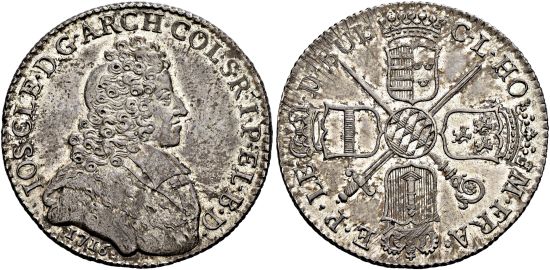 "BELGIUM | Lüttich, Bistum. Josef Klemens von Bayern, 1694-1723. Patagon 1716, Liège. Von grösster Seltenheit. Gutes vorzüglich. NGC AU58. Feine Patina. (Belgium, bishopric of Liège, Joseph Clement of Bavaria, 1694-1723, patagon of 1716, Liège mint. Of the highest rarity, Good extremely fine, Nicely toned.)"