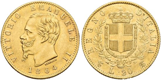 This specimen was lot 2557 in Sincona sale 80 (Zurich, October 2022), where it sold for 2,557 CHF (about US$3,065 including buyer's fees). The catalog description[1] noted, "ITALY | Königreich, Vittorio Emanuele II. 1861-1878. 20 Lire 1864, Torino. About uncirculated." This specimen is one of a series struck 1861-70 at the Turin mint during the reign of Victorio Emanuele II of Italy (1861-78). It is struck to the same standard as the contemporary French twenty francs. This type was also struck in Rome (1870-78) and Milan (1872-74).