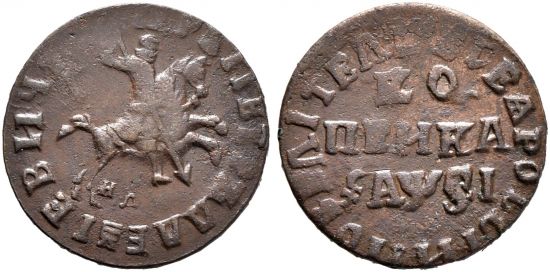 "Kopeck 1716, Naberezhny Mint, ND. Very rare. 15 roubles according to Ilyin. Slightly off-centered. Very fine. (Копейка 1716, Набережный МД, НД. 7,61 г. Биткин 3111 (R2). Очень редкая. 15 рублей по Ильину. Небольшое смещение. Состояние очень хорошее.")