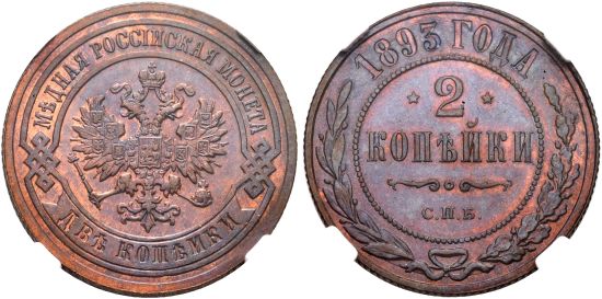 This specimen was lot 556 in Sincona sale 78 (Zurich, October 2022), where it sold for 325 CHF (about US$390 including buyer's fees). The catalog description[1] noted, "RUSSIA | Russian Empire and Federation | Alexander III. 1881-1894, 2 Kopecks 1893, St. Petersburg Mint, SPB. NGC MS65 BN. Extraordinary condition." This type is listed for 1867-71, 1876-1914. Most dates are common with, of course, the exception of the proofs.