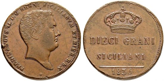 "ITALY, Naples / Sicily, Ferdinando II. 1830-1859 10 Grani 1836. Palermo. Von grösster Seltenheit. Vorzüglich. Kleine Randschläge. (kingdom of the two Sicilies, Ferdinand II, 1830-59, ten grani of 1836, Palermo mint. Of the highest rarity, Extremely fine, Minor edge bumps.)"