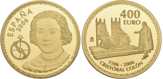 "BULLION AUCTION | SPAIN | Königreich. Juan Carlos I. 1975-2014. 400 Euro 2006. Cristobal Colon. Feingewicht: 27 Gramm. 3'000 Exemplare geprägt. Polierte Platte. Im Originaletui mit Zertifikat. (kingdom of Spain, Juan Carlos I, 1975-2014, four hundred euros of 2006, 400th anniversary of the death of Columbus. 3,000 pieces struck, Choice Proof, In original box with certificate.)"