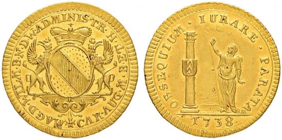 Friedberg lists four different ducats for 1738, all rare, all with the same obverse. The SCWC only shows one (equivalent to Fr-138), the rest are consigned to the Unusual World Coins. This ducat commemorates the loyalty offered by the town of Badenweiler in the Black Forest; the city arms are attached to the column on the reverse. The Latin motto, "OBSEQUIUM IURARE PARATA," means "Ready to swear [loyalty]."