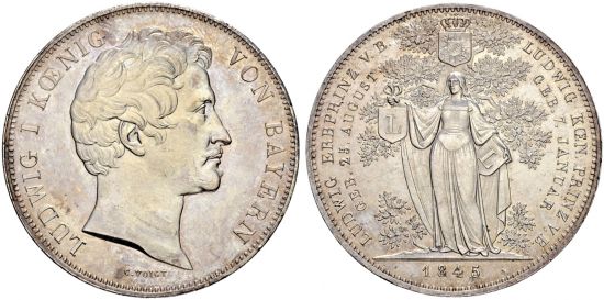 "DEUTSCHLAND | Bavaria, Ludwig I. 1825-1848. 2 Vereinstaler 1845, München. Geburt des Erbprinzen Ludwig. Prachtvolle Erhaltung. Fast FDC. (Germany, kingdom of Bavaria, Louis I, 1825-48, double union thaler of 1845, Munich mint, for the birth of crown prince Louis. Cabinet piece. About uncirculated.)"