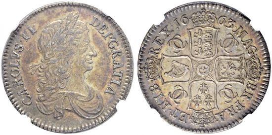 "GREAT BRITAIN | Königreich, Charles II. 1660-1685. 1/2 Crown 1663, London. Regierungsjahr XV. Selten in dieser Erhaltung. (kingdom of Great Britain, Charles II, 1660-85, half crown of 1663, London mint, regnal year XV. Rare in this condition. NGC AU58.)"