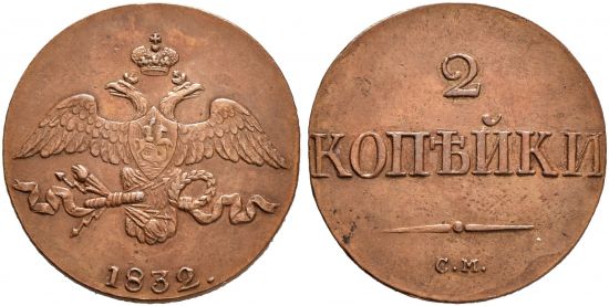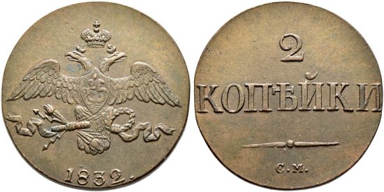 "2 Kopecks 1832, Suzun Mint, SM. Rare. 0.5 roubles according to Petrov. 1 rouble according to Ilyin. About extremely fine. (2 копейки 1832, Сузунский МД, СМ. 10,23 г. Биткин 685. Редкие. 0,5 рубля по Петрову. 1 рубль по Ильину. Состояние практически отличное.)"