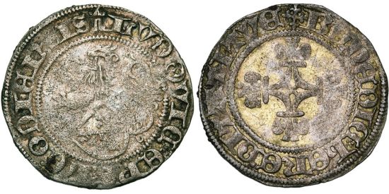 "LIEGE, Principauté, Louis de Bourbon (1456-1482), AR demi-aidant à l'écu (demi-patard), s.d. (vers 1477). D/ + LVDOVIC' EPS' LEODIENSIS Ecu de Bourbon entouré de trois petits lis. R/ + BENEDIC HEREDITATI TVE Croix ornée, un sautoir au centre. De la plus haute rareté. Légère faiblesse de frappe. Très Beau. (principality of Liège, Louis of Bourbon, 1456-82, undated silver half aidant or half patard, circa 1477. Obverse: arms of Bourbon, three liies around; reverse: ornate cross, a sautoir at the center. Of the highest rarity, lightly struck, Very Fine.)
