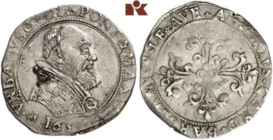 "KIRCHENSTAAT/VATIKAN Urban VIII. 1623-1644. 1/2 Franco 1637 oder 1639 (Jahreszahl nicht lesbar), Avignon. RR Sehr schön. (Papal States, Urban VIII, 1623-44, half franco of 1637 or 1639 (illegible last digit), Avignon mint. Rare, very fine.)"
