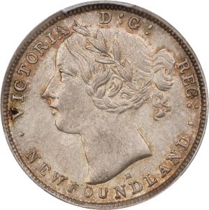 This specimen was lot 55643 in Stack's Bowers NYINC sale (New York, January 2024), where it sold for $192. The catalog description[1] noted, "CANADA. Newfoundland. 20 Cents, 1876-H. Birmingham (Heaton) Mint. Victoria. PCGS Genuine--Cleaned, AU Details." This type was struck fairly steadily for Newfoundland 1865-1901, which preferred twenty cent pieces to the quarters used in Canada proper. It is rather low priced in circulated condition but rare in high grade. The smallness and poverty of the colony kept mintages low. This date shares most common date status with 1881.