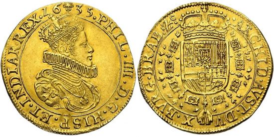 "BRABANT, Duché, Philippe IV (1621-1665), AV double souverain, 1635, Bruxelles. Premier type. D/ B. couronné et cuirassé à d., une grande fraise au col. R/ Ecu couronné, entouré du collier de la Toison d'or. Très rare. Superbe. Provient de notre vente 124, 14 mars 2015, 556. Voir l'agrandissement en couverture. (duchy of Brabant, Philip IV, 1621-65, gold double souverain of 1635, Brussels mint, first type. Obverse: crowned, armored and ruffed bust right; reverse: crowned arms, Order of the Golden Fleece around. Very rare, Extremely Fine.)"