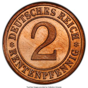 This specimen was lot 33948 in Heritage sale 3076 (Long Beach, CA, September 2019), where it sold for $420. The catalog description[1] noted, "Germany: Weimar Republic Proof 2 Pfennig 1924-A PR65+ Red PCGS, Berlin mint. The only example of this denomination we have been able to locate in Proof format, suggesting a rather notable rarity with the series, and one which borders on technical perfection." This type was struck 1923-24 and overlapped the 2 reichspfennig (KM 38) of 1924-29, which used a very similar design.
