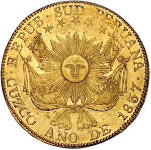 This specimen was lot 3550 in the Eliasberg sale, where it sold for $6,670. The catalog description[1] noted, "1837 BA 8 escudos. Cuzco mint. South Peru. MS-62 (NGC). Types as above. Lustrous yellow gold, somewhat reflective on both sides. Lightly hairlined and showing some softness of strike, but free of planchet flaws and very attractive. Another specimen of this intricately rendered design." There is a similar eight escudos issued by the "Estado Sud Peruano."
