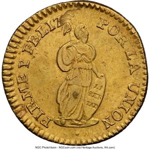 This specimen was lot 25286 in Heritage sale 61487 (Dallas, TX, May 2025), where it sold for $2,250. The catalog description[1] noted, "Peru. Republic gold Escudo 1829 LM-JM AU55 NGC, Lima mint. A date and denomination exclusively witnessed at the lower end of the grading scale, with those few seen in recent decades well-handled VFs. While diminutive, the piece on offer packs a punch as the sole finest of an already scarce date, showcasing ample remnant detail and appreciable appearances. Accompanied by the original collector envelope. From the Monedero Collection of Peru and Latin American Coins." This is from a type struck at Lima 1826-33. Cuzco also minted this type in 1826 and 1830.