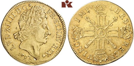"KÖNIGREICH Louis XIV, 1643-1715. Double louis d'or aux huit L et aux insignes 1702, A, Paris. Réformation. GOLD. RR Kl. Schrötlingsfehler, sehr schön. (kingdom of France, Louis XIV, 1643-1715, gold double louis of the 8 L's and insignia of 1702, Paris mint, struck on older coin. Rare, planchet cracks, very fine.)"