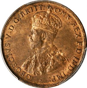 This specimen was lot 23186 in Stack's Bowers NYINC sale (Newport Beach, CA, January 2021), where it sold for $168. The catalog description[1] noted, "AUSTRALIA. Penny, 1917-I. Calcutta Mint. PCGS MS-63 Red Brown Gold Shield. A coin with plenty of mint red and without marks or hairlines. The crown is a little softly struck, which may have influenced the assigned grade. In 1917, at the height of World War One, the Sydney and Perth mints struck gold while Melbourne struck gold and silver. The Calcutta mint was contracted to strike halfpence and pence." The Calcutta mint struck pennies for Australia 1916-18; of the three dates, this is the most common. After World War One, in 1919, Melbourne took over production.