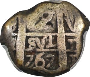 This specimen was lot 26388 in Stack's Bowers NYINC sale (New York, January 2023), where it sold for $264. The catalog description[1] noted, "BOLIVIA. Cob 2 Reales, 1767-P V-Y. Potosi Mint. Charles III. PCGS VF-25. Fairly well worn from time in circulation, this wholesome specimen nevertheless sports a clear date and remains problem-free. From the Mark and Lottie Salton Collection." Milled coinage was introduced at the Potosí mint in 1767 but the production of cobs did not cease. In fact, in 1771, milled coinage was suspended there. The mintmaster was rebuked for this and forced to return to milling coins in 1773 with the introduction of portrait coinage.