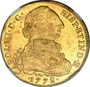 This specimen was lot 23406 in Heritage sale 3030 (New York, January 2014), where it sold for $4,700. The catalog description[1] noted, "Carlos III gold 8 Escudos 1772 NR-VJ, MS62 NGC. Boldly struck, with full, gleaming mint luster. The surfaces exhibit only a few tiny marks and the overall appearance is far nicer than one might expect of an MS62 certified coin. We doubt you will ever see a nicer example with this stated grade. Rare in this condition." This "standard bust" eight escudos, struck 1772-84, superseded the "rat nose" bust used 1762-71. The Popayán mint also adopted the new bust, dropping the old bust of the prior king, Ferdinand VI, used until 1771. The year marked a debasement from 0.917 fine to 0.901 fine gold.