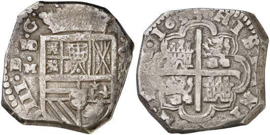 This specimen was lot 1396 in Aureo y Calicó sale 423 (Barcelona, December 2023), where it sold for 6,000 € (about US$7,769 including buyer's fees). The catalog description[1] noted, "1635. Felipe IV. Madrid. M. 8 reales. Fine example for this mint. Ex Aureo y Calicó 03/08/2012, no. 1161. Very Rare, especially in this condition. MBC [very fine]." This scarce type was struck 1621, 1627, 1631-35, 1639-44, 1649-51, 1659-62. Many varieties exist in the position of the mintmark and denomination, which was sometimes written "8" and sometimes "VIII". At this time, the Madrid mint was a private venture and its mintmark did not bear the crown used later.