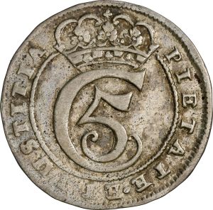 This specimen was lot 10276 in Stack's Bowers Collectors Choice Online Auction (Costa Mesa, CA, February 2025), where it sold for €145 (about US$151). The catalog description[1] noted, "DENMARK. 2 Mark, 1681-GS. Copenhagen Mint. Christian V. NGC AU Details--Cleaned. From the L. E. Bruun Collection." This type was struck 1681-82, all with mintmaster's initials "GS". Varieties exist in the size of the lettering. One krone was four mark or two-thirds speciedaler.