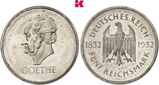 "DEUTSCHE MÜNZEN AB 1871 · WEIMARER REPUBLIK, 5 Reichsmark 1932 A. Goethe. Etwas Belag, winz. Haarlinien, polierte Platte. (Germany, Weimar republic, five mark of 1932, Goethe. Slightly rough, some hairlines, Proof.)"