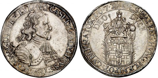 "DEUTSCHER ORDEN, DEUTSCHER ORDEN IN MERGENTHEIM Johann Caspar von Ampringen, 1664-1684. Reichstaler 1673, Mainz. Hübsche Patina, sehr schön-vorzüglich. (Teutonic Order in Mergentheim, John Caspar of Ampringen, 1664-84, thaler of 1673, Mainz mint. Hadsome patina, very fine to extremely fine.)"