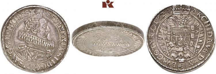 This double thaler is very scarce but not extremely rare like most multiple thalers. Other Austrian single thalers for 1624 include Dav-3104, Dav-3078, -3106, Dav-3123, -3144, -3146, -3146A, -3104A, -3330A, Dav-3092, -3080, -3081, -3083, Dav-3084, Dav-3085, -3086, Dav-3087, -3087A and Dav-3330.