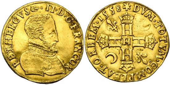 "FRANCE, Royaume, Henri II (1547-1559), AV double Henri d'or, 1558H, La Rochelle. 1er type. D/ B. cuir. à d., tête nue. Avec légende REX HERCVS (sic) II. Différent: hure de sanglier dans la légende (Pierre le Grand). R/ Croix formée de quatre H couronnés, cantonnée de deux lis et deux croissants, la lettre d'atelier en coeur. Très rare Beau portrait et excellent pedigree. Très Beau à Superbe. Provient de Bourgey, 29 janvier 1991, 253A et 1er décembre 1965, 40 et de la collection de Marchéville, vente Florange et Ciani, 21 mai 1928, 2614. (kingdom of France, Henry II, 1547-59, gold double henry of 1558, La Rochelle mint, first type. Obverse: armored bust right, with bare head and misspelled legend; reverse: cross formed of four crowned "H's", cantonned with two lilies and two crescents, mintmark in the center. Very rare, nice portrait and excellent provenance. Very Fine - Extremely Fine.)"