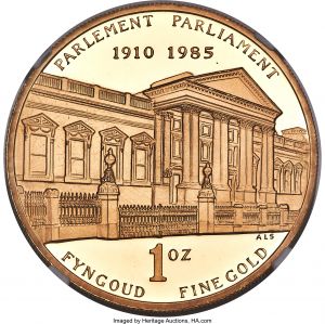 This specimen was lot 31176 in Heritage auction 3096 (Dallas, TX, March 2021), where it sold for $2,640. The catalog description[1] noted, "South Africa: Republic gold Proof "75th Parliament Anniversary" Ounce 1985 PR69 Ultra Cameo NGC, Pretoria mint. Struck to commemorate the 75th anniversary of the Parliament and depicting a lovely, frosted architectural scene. From the Paramount Collection." South Africa, after a turbulent history between English and Dutch settlers and the native population, was constituted the Union of South Africa in 1910. Coinage commenced in 1923. This commemorative honors the parliament building in Cape Town.