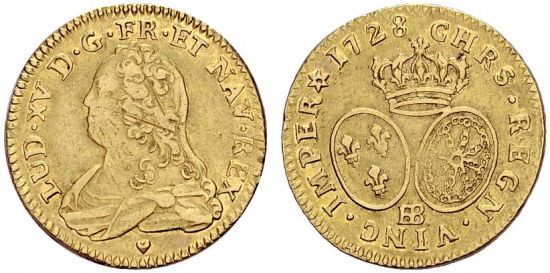 "FRANKREICH Louis XV. 1715-1774. Louis d'or aux lunettes 1728, Strasbourg. Av. min. just. Sehr schön-gutes sehr schön. (France, Louis XV, 1715-74, louis d'or 'of the eyeglasses' of 1728, Strasbourg mint. Light adjustment marks on the obverse, very fine to good very fine.)"
