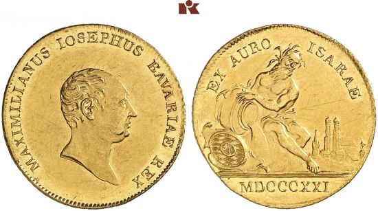 "BAYERN, HERZOGTUM, SEIT 1623 KURFÜRSTENTUM, Maximilian I. (IV.) Joseph, 1799-1806-1825. Dukat 1821. Isargold. GOLD. RR Etwas berieben, feine Kratzer, vorzüglich. Erworben 1937 bei der Firma Julius Jenke, München. (Germany, kingdom of Bavaria, Maximilian IV Joseph, ducat of 1821, gold from the Isar. Very rare, polished, fine scratches, extremely fine. Bought from Julius Jenke in 1937.)"