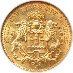 This specimen was lot 30026 in Heritage sale 3041 (Chicago, August 2015), where it sold for $1,116.25. The catalog description[1] noted, "Hamburg. Free City gold 10 Mark 1896-J MS64 NGC, Hamburg mint, Choice for the grade with unusually vibrant golden color over the obverse and reverse that immediately pleases the eye upon first sight. While considered a common type, examples as appealing as the present are certainly the exception to the norm. From The Kaiser Collection of German Gold Coins." This type was struck 1890-1913 while Hamburg was part of the Empire, the collapse of which ended the last local coinages.