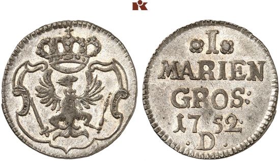 "BRANDENBURG-PREUSSEN, PREUSSEN, KÖNIGREICH, Friedrich II. der Große, 1740-1786. Mariengroschen 1752, D, Aurich. Prägung für die westlichen Landesteile. Adler mit Schwert und Zepter und mit symmetrisch geformten Schild. RR Vorzüglich. Exemplar der Auktion Fritz Rudolf Künker 90, Osnabrück 2004, Nr. 4537. (Germany, kingdom of Prussia, Frederick II the Great, 1740-86, mariengroschen of 1752, Aurich mint, struck for the western provinces. Eagle with sword and scepter and symmetrical shield. Very rare, extremely fine.)"