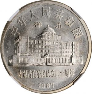 "CHINA. Yuan, 1987. NGC MS-66. Bank specimen variety. Celebrating the 40th anniversary of the Mongolian Autonomous Region, this variant features two additional characters on this building side referring to its status as a 'bank specimen.' Fairly RARE and highly radiant."