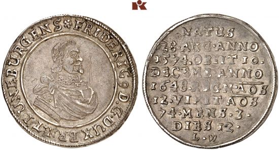 "BRAUNSCHWEIG UND LÜNEBURG, BRAUNSCHWEIG-LÜNEBURG, FÜRSTENTUM, Friedrich, 1636-1648. 1/8 Reichstaler 1648, Clausthal, auf seinen Tod am 10. Dezember. Von großer Seltenheit. Feine Patina, vorzüglich. Aus der Sammlung eines Ingenieurs. Exemplar der Auktion Fritz Rudolf Künker 49, Osnabrück 1999, Nr. 1713. (Germany, duchy of Brunswick-Luneburg-Celle, Frederick, 1636-48, one eighth thaler of 1648, Clausthal mint, on his death on December 10. Extremely rare, fine patina, extremely fine.)"