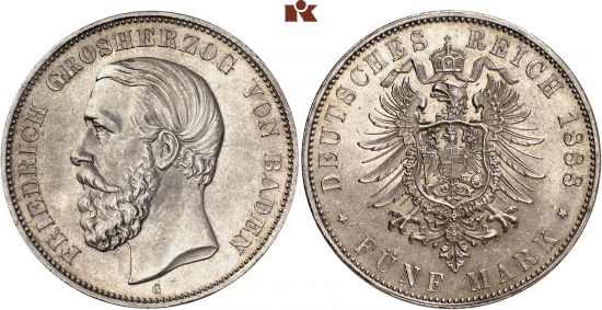 "REICHSSILBERMÜNZEN, BADEN, Friedrich I. 1852-1907. 5 Mark 1888, ohne Querstrich im A. Sehr selten in dieser Erhaltung. Prachtexemplar. Fast Stempelglanz. (Germany, grand duchy of Baden, Frederick I, 1852-1907, five mark of 1888, without crossbar in A, rare in this quality, choice example, about uncirculated.)"